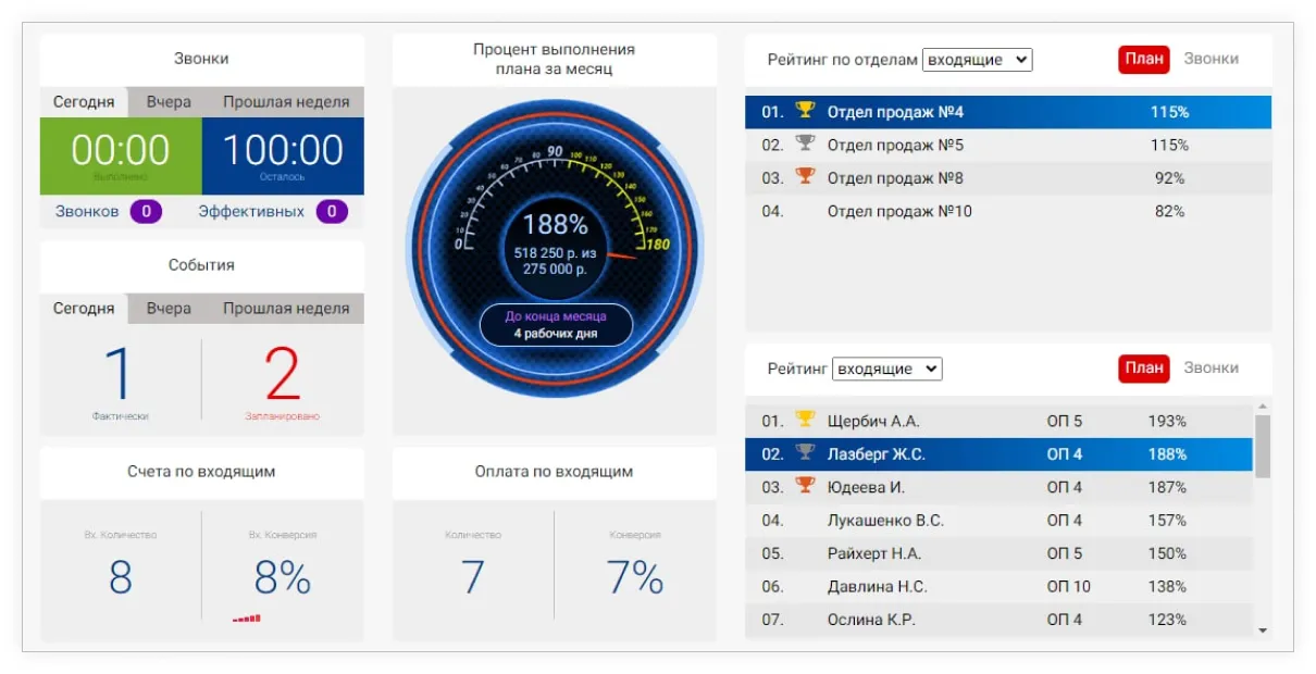 Самой интересной разработкой стал дашборд личных показателей каждого сотрудника. В любой момент можно зайти в него, чтобы узнать, насколько ты продвинулся в выполнении плана на месяц. Туда же выводится внутрикорпоративный рейтинг.